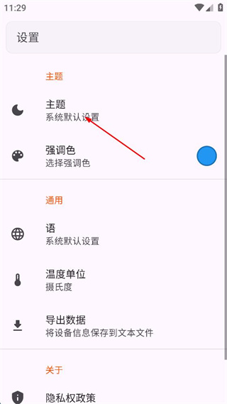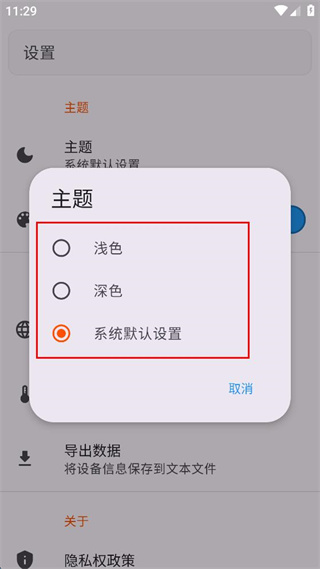 4、在主题选择窗口中可选择浅色、深色、系统默认设置三种主题模式。