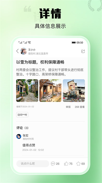 村脉软件是一款包含了村子手艺以及发展方向的介绍,会第一时间带来关于家乡最新的信息,如村史馆、功德榜等等,这些都适合让在外的年轻人了解目前农村发展的进度,不仅如此,还可以在线发布当前村里面比较热门的商品,直接分享给周围的好友可以更快速的进行了解和选择,也能叫上其他用户一起感受,如果有当地的美食介绍,还能发展当地的旅游经济,让更多的用户发现这样宝藏的地方。