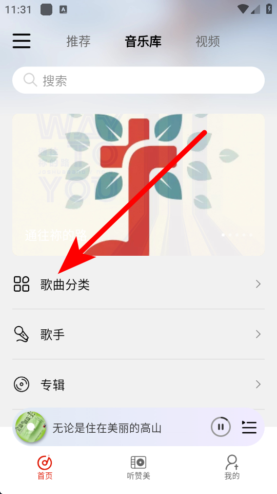 2、在音乐库页面,点击歌曲分类选项,进入歌曲分类界面。