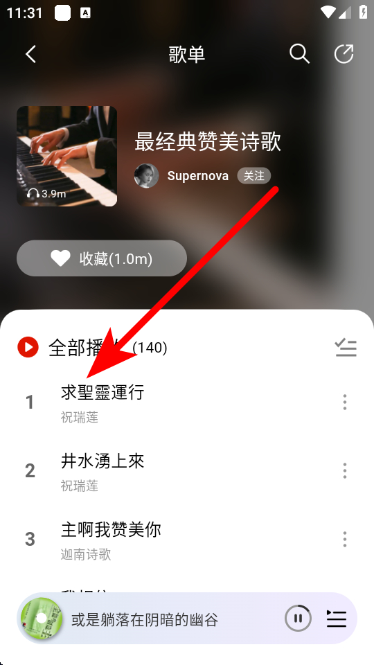 4、在歌单详情页面,点击想要播放的歌曲,如求聖靈運行,即可开始放歌。