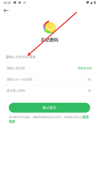 3、在跳转到忘记密码页面后,点击输入框填写手机号码以便获取验证码。