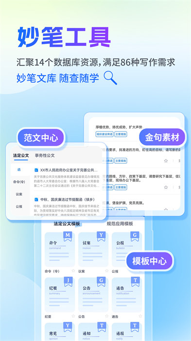 新华妙笔app官方正版是一款非常好用的智能写作软件,整体软件的功能强大且免费,任何时间都能点击并查找到公文的资料,并且还能按照你的需求进行写作,整个文章当中一定能看到固定的关键词,同时还能在线查找一些可以使用的素材,致力于让自己书写的公文看起来更加出色。