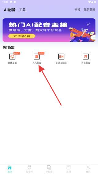 1、启动配音师app,进入到首页内点击真人配音的功能按钮。