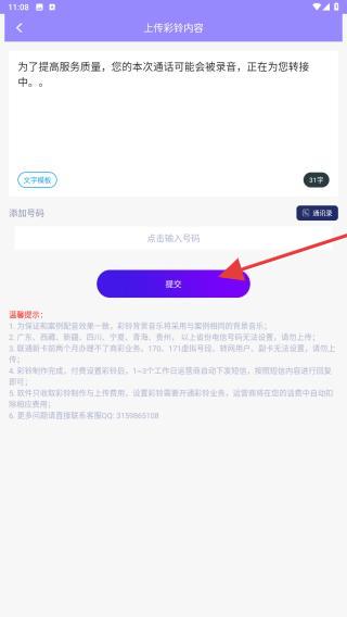 4、添加手机号后,点击提交的按钮即可完成配音。
