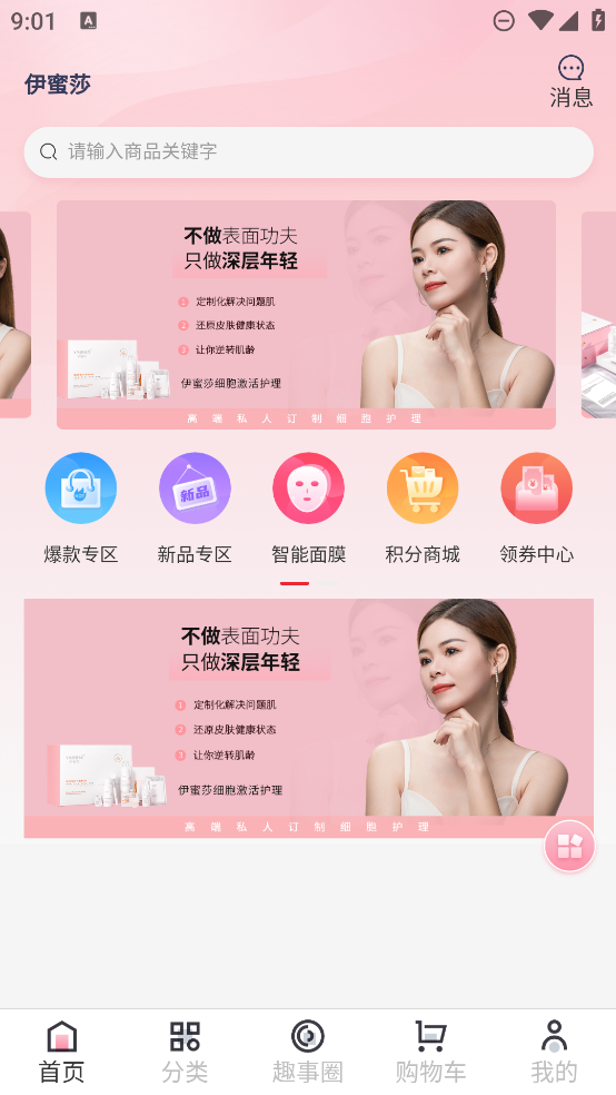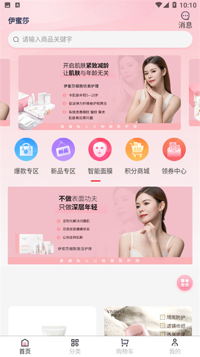 伊蜜莎app是一款专门为女性打造的线上购买护肤品和化妆品的一款app,app主要售卖的就是女性的护肤品和化妆品,为更好的呵护每个女性的肌肤,用户在线上购买所需要的商品,用户可以在商城主页搜索关键字查找说需要的商品,在这款APP中,用户可以选择到更适合自己的护肤品,用户可以选择购买自己所需要的护肤品,app中还拥有智能面膜的功能,用户可以通过连接设备然后输入面膜ID然后根据用户所使用的设备对用户使用适合的功能, 用户还可以在这款APP中与其他用户讨论关于护肤和化妆的话题。