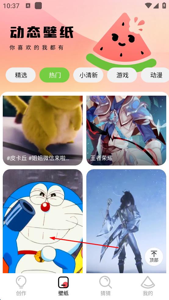 2、在浏览过程中,挑选出自己喜欢的动态壁纸,比如带有哆啦A梦形象的,点击该壁纸进入详情页面,查看壁纸的动态效果。