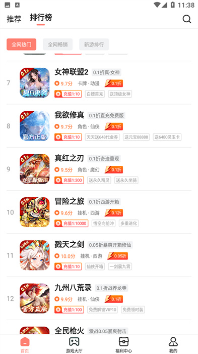 2、用户可以在排行榜中查看到各种热门的游戏和全网畅销、新游排行榜的游戏,用户可以查看;