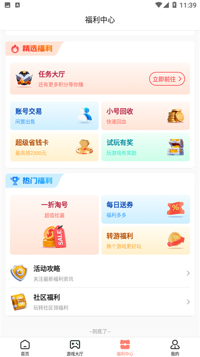 4、在福利中心中可以领取各种类型的小游戏,出售或购买账号,做任务领取福利,领取各种福利。
