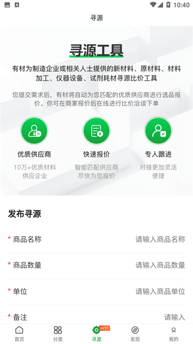 3、在寻源工具中,用户可以通过输入商品名称、商品数量和单位等查询材料的优质供应商;