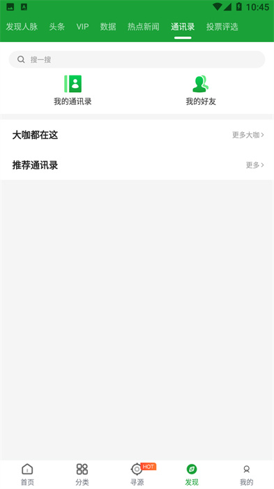 4、通过app中的发现功能用户可以发现更多的人脉信息,查看热点新闻和用户的通讯录信息。