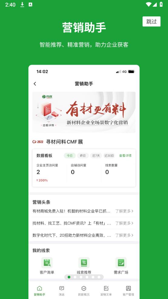 有材app是一款关于关于数字营销管理工具,用户可以通过这款app学习到如何提高质量和管理方法增加销售额,用户可以使用app查看CMF 库,材料库,工艺库,案例库等各种用户需要的东西,用户可以通过app购买到更多的新材料、原材料、材料加工、仪器设备等各种材料,用户可以通过刚进软件时选择材料端或者制作端,材料端时材料企业或相关人士选择,制造端是制造企业或相关人士选择,用户可以通过app购买到更多的商品,或者制作厂商可以通过这款app出售制作的商品,用户可以通过寻源工具查询到所需要的材料信息,也可以查看到各种人脉信息和各种头条信息,app中包含可各种功能,用户都可以使用。