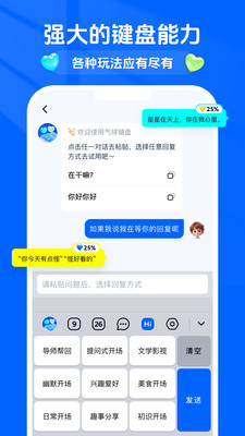 气球键盘app是一款适合在多个安卓设备上直接使用的键盘软件,其中给大家设置了回复以及各种表情包资源,在不知道如何沟通的小伙伴能够直接选择,十分的便利,不需要在绞尽脑汁的找高情商回复内容,如果你日常也经常遇到类似的问题,感兴趣的小伙伴快来下载吧!