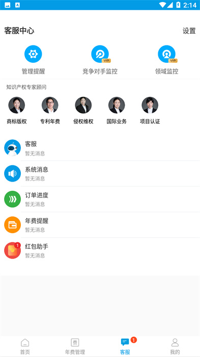 在客服中心中用户可以在这里查看到各种知识产权的专家顾问和竞争对手监控等。