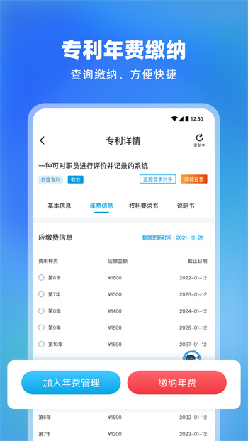 用户可以在专利管理中查看到专利管理和年费管理,用户可以看到自己的专利数量;