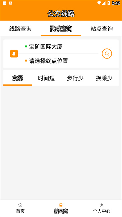 4、输入目的地和终点后会为用户推荐乘坐时间短的方案或者换乘少、步行少的方案。