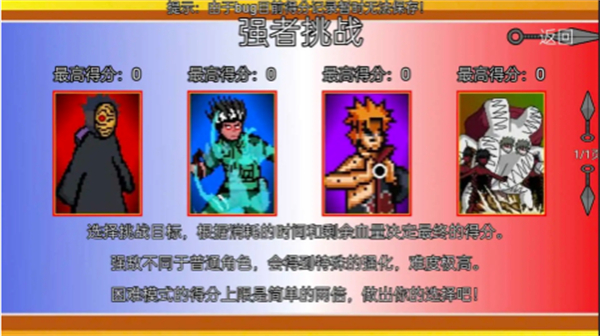 像素火影韩涵终章是一款由B站up主鼬神自制的像素火影改版游戏,玩家将能够在游戏中看见各种熟悉的火影忍者角色,这些不同的角色将会有着不同的战斗能力,会带给玩家们以刺激的战斗体验感,同时,玩家还将需要不断的进行全新战斗技能的学习和练习哦!