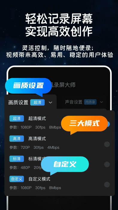手机录屏录大师极速录制app是一款专门为了用户们录制视频打造出来的软件,这款软件还提供了声音和麦克风的功能内容,用户们可以更加方便的处理自己的录屏效果,不一样的高清格式都是支持的,后期编辑和处理的额操作都支持。