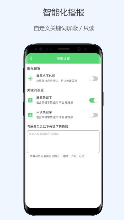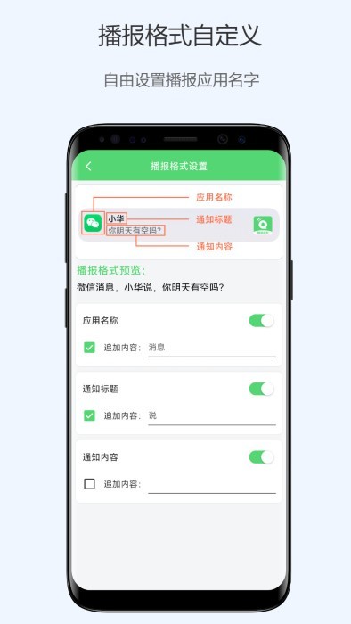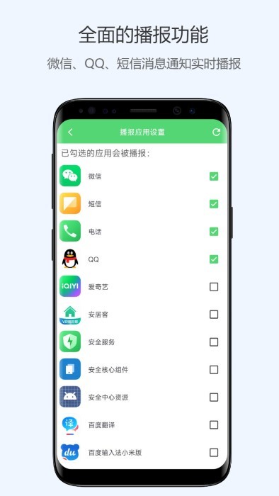 2、自行设置需要播报的通知软件信息,方便进行各种消息通知的管理;