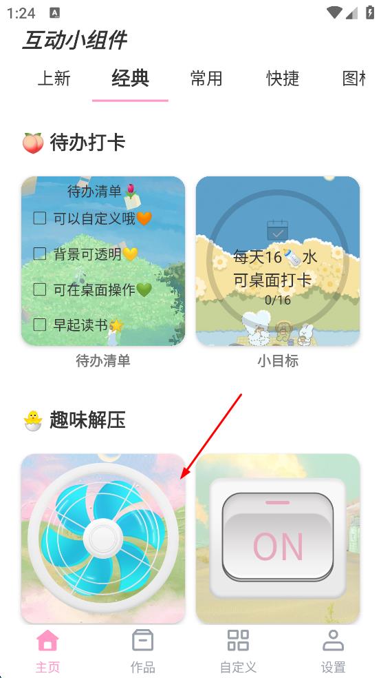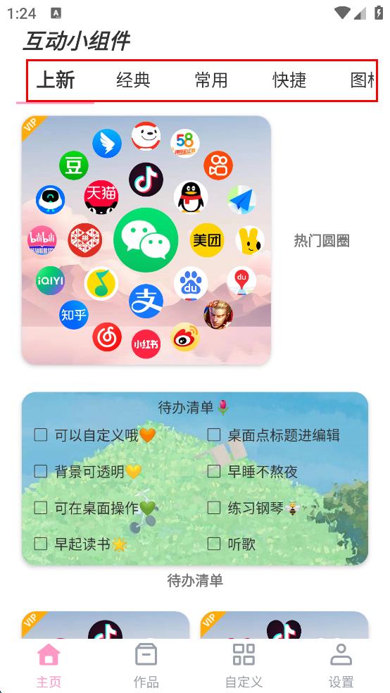 1、打开互动小组件应用,在页面上方的分类标签中,找到并点击感兴趣的分类,进入进行浏览寻找。