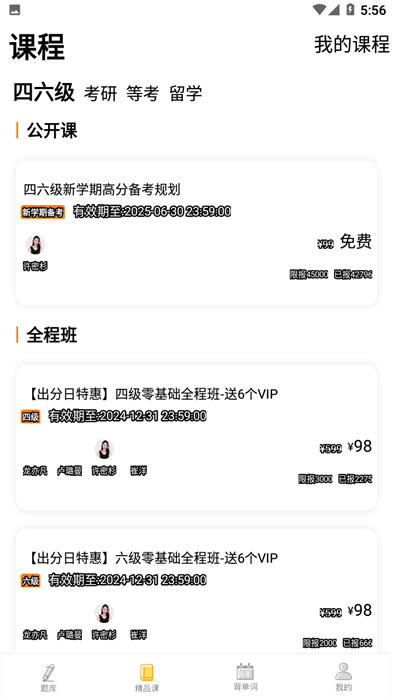 在精品课程中用户可以看到四六级、考研、计算机等级考试学习资料,还有各种练习真题等各种学习资料;