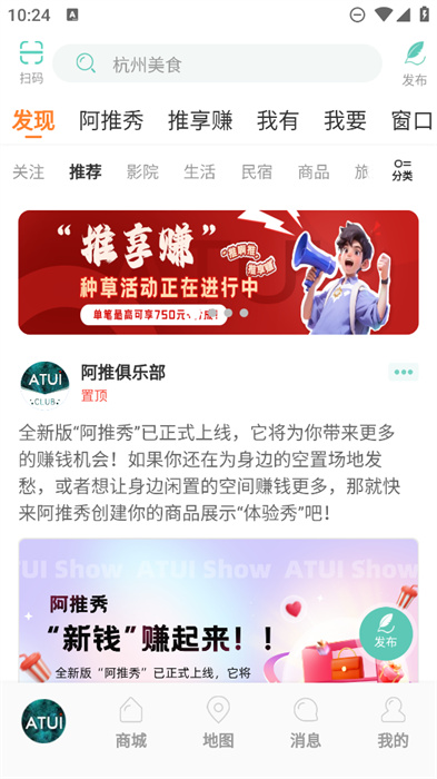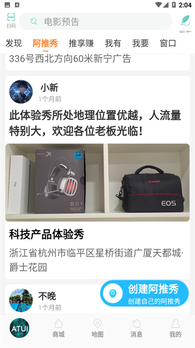 各种种草视频还有各种店铺推荐,还有其他用户发布的各种体验秀,还可以自己创建阿推秀发布视频;