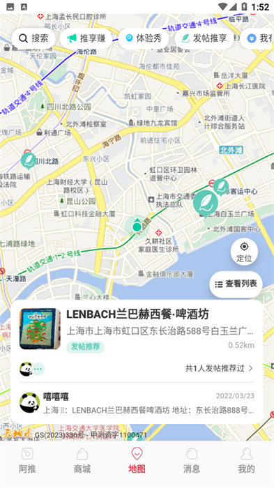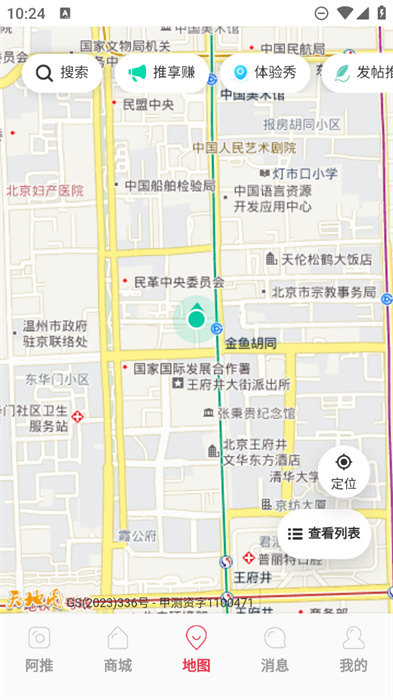 在地图中可以查看到app内发布的推广店铺地信息,用户可以报名参加店铺推广并发布推广视频就可以获得佣金;