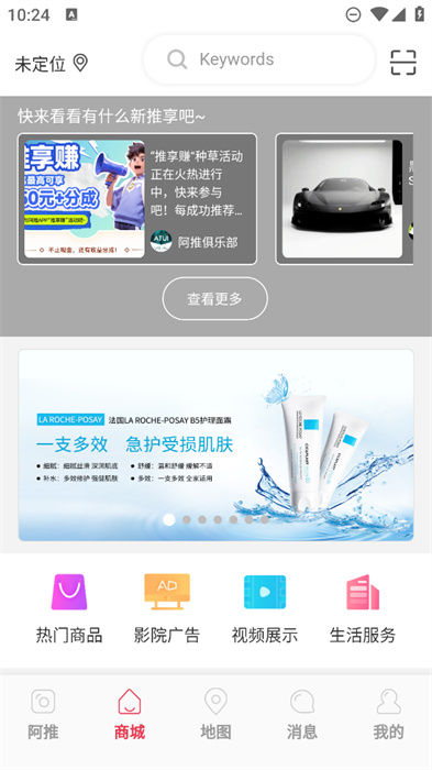 阿推app是一款线上购物的app,在app中不仅可以购买各种商品还可以看到其他用户推荐的商品信息等,为了让用户更了解自己适合什么,想要什么,为用户推荐了各种商品,还有用户发布的其他的视频,通过查看地图上的店铺,选择店铺推广,然后就可以赚钱,app中还有各种进口的护肤品、化妆品、洗头膏、沐浴露等各种商品,还可以在商场里投广告,还有各种商品或者经典的视频展示,app中包含了各种类型的商品,还有可以通过地图选择可以推广的店铺,这款app会根据用户浏览的商品还有视频为用户推荐商品,app中还有各种类型地商品,有需要的用户快来下载使用吧。