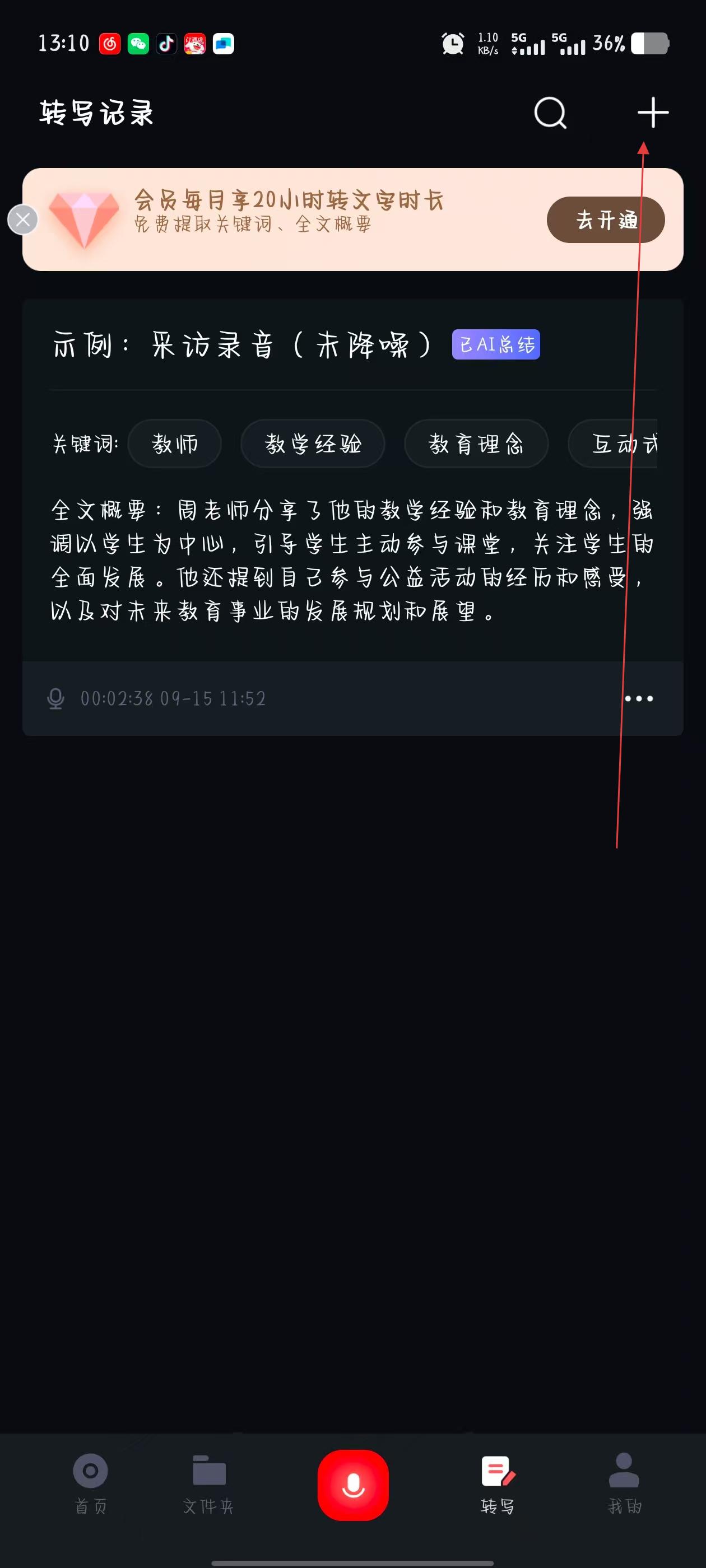 1、打开录音专家APP,进入转写记录页面,点击右上角的+号,进入音视频选择界面。
