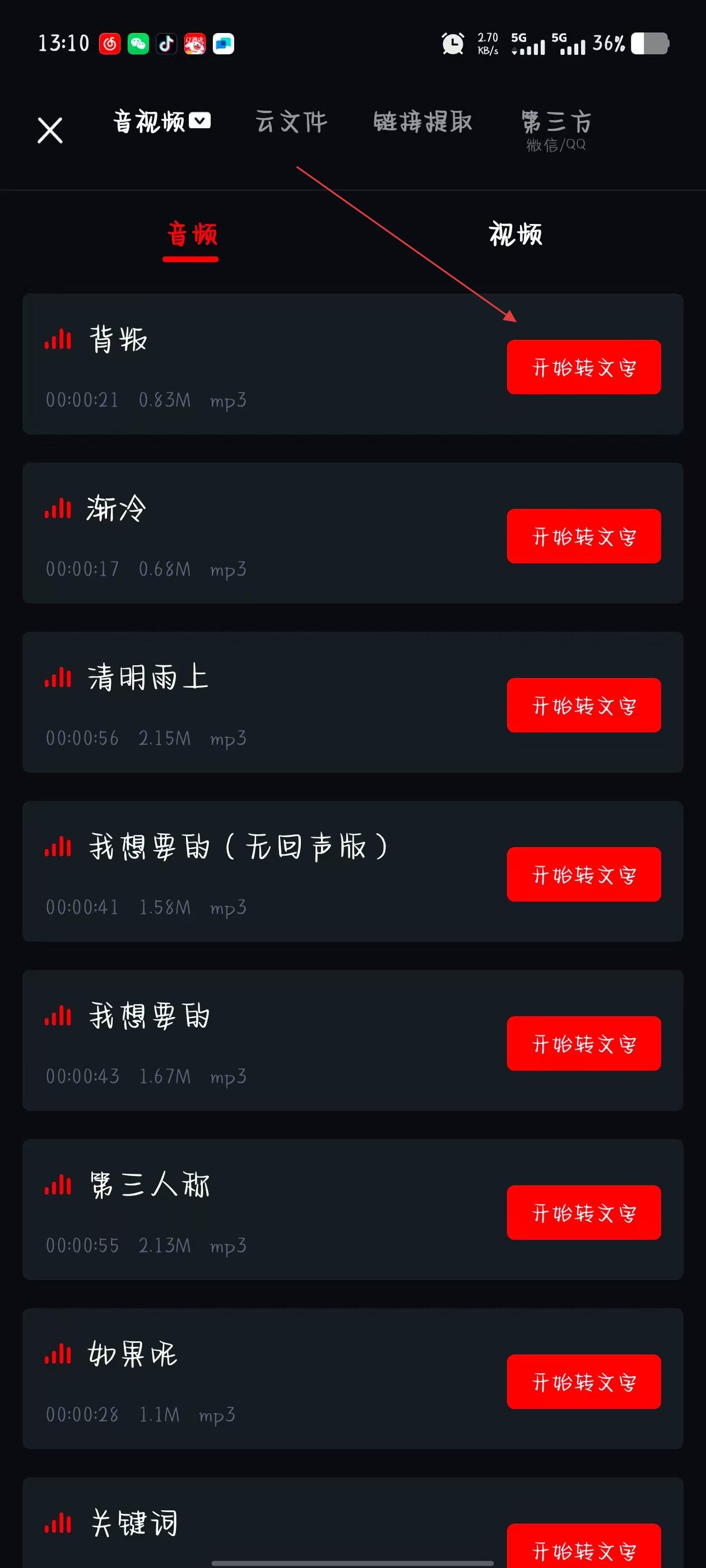 2、在音视频选择界面,找到需要转写的音频文件,点击该音频右侧的开始转文字按钮。