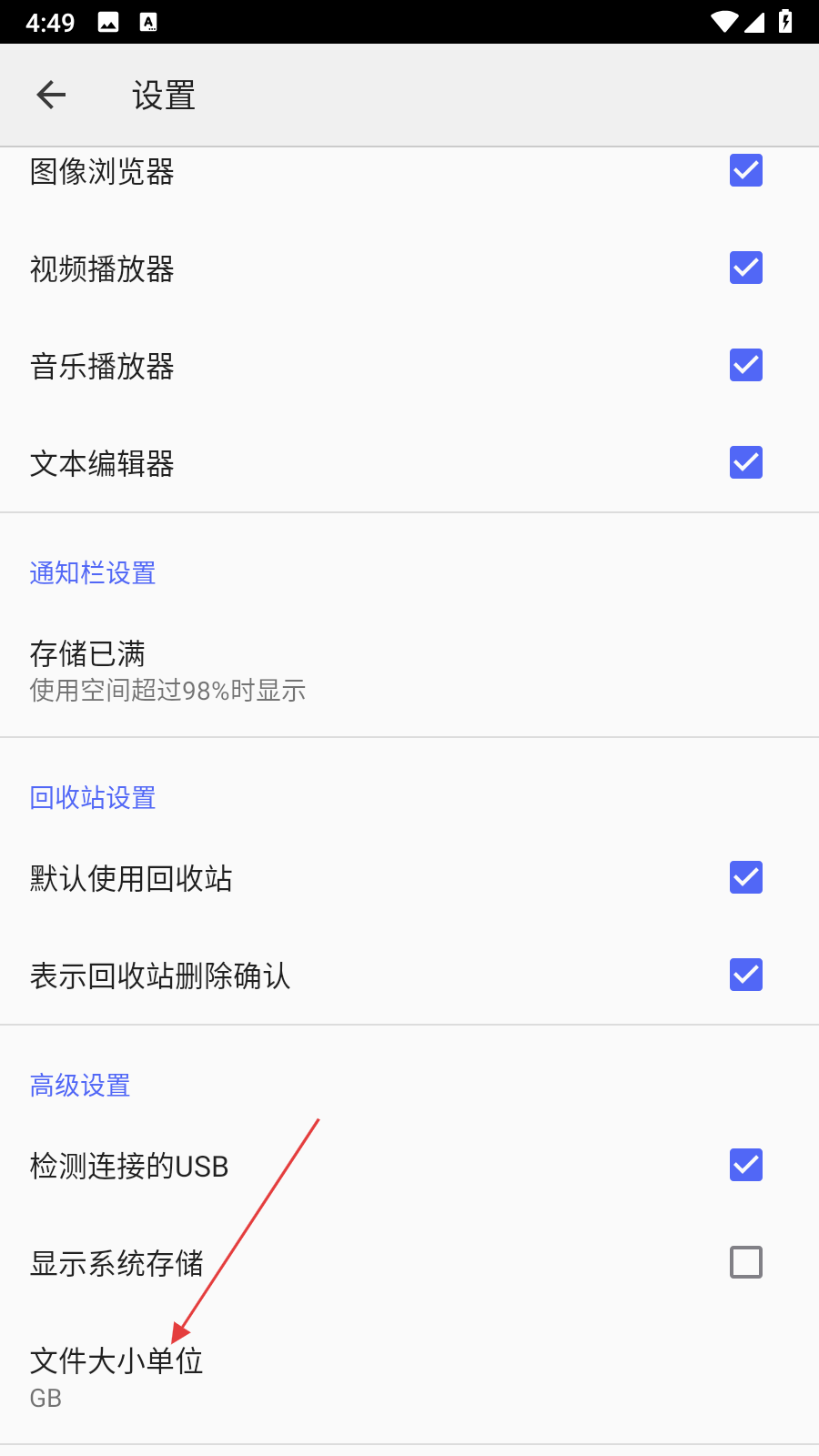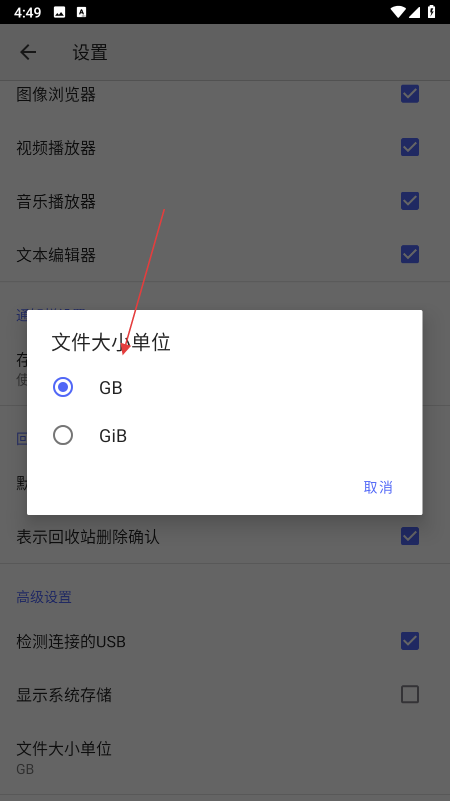 3、在设置页面里,找到文件大小单位选项,点击该选项,弹出文件大小单位的选择框。