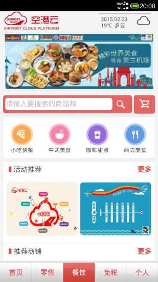 5、旅客可通过餐饮模块线上购买机场多家店铺所推出的主打精美餐饮产品并享受折扣价;