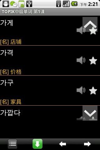 韩语单词天天记支持韩语单词发音,需要网络接入。可以将单词添加到我的收藏夹,以进强化记忆。
