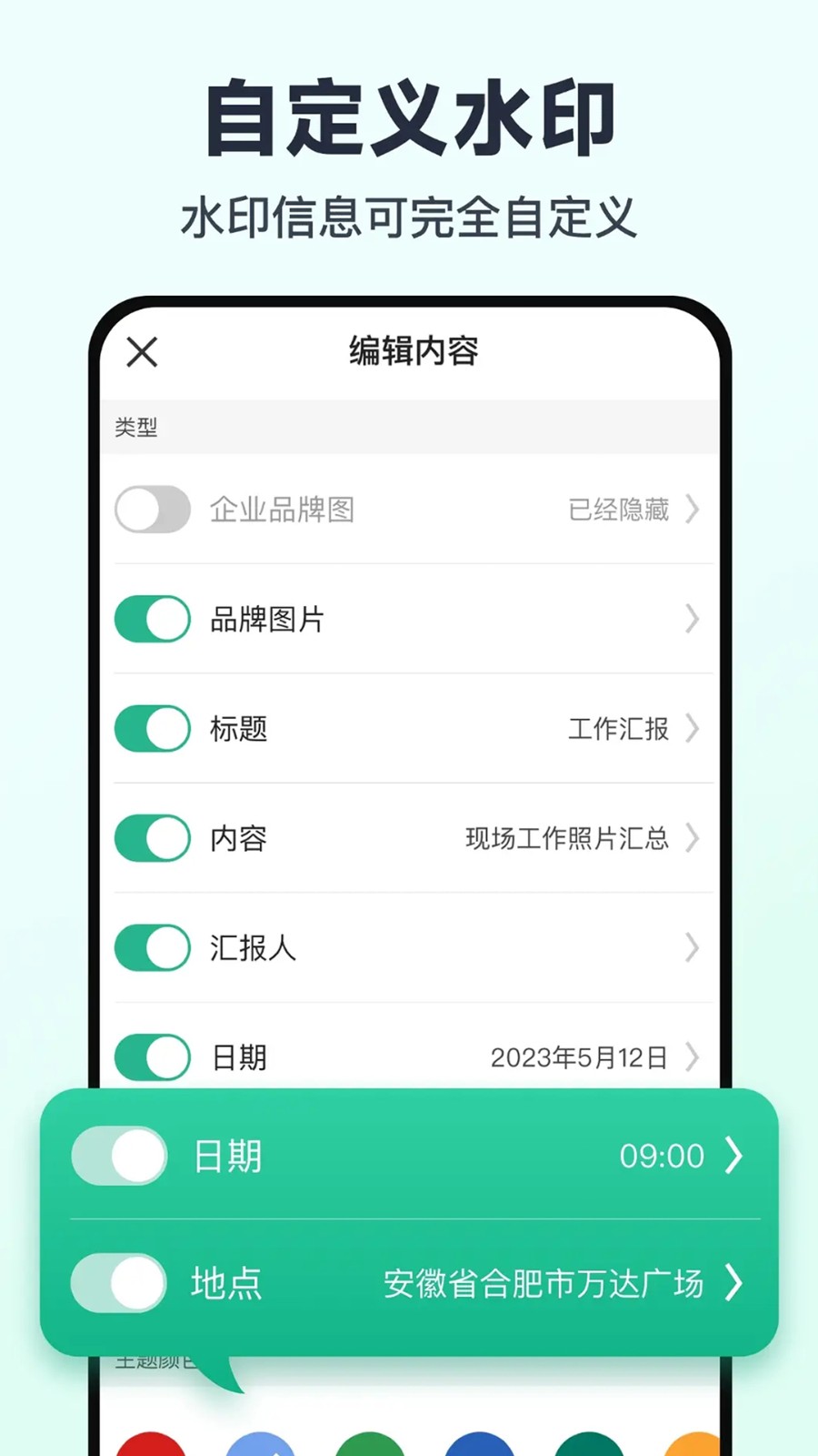 1、自定义水印中的显示内容参数桃姐,还能修改水印大小和位置、logo等;
