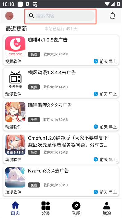 1、打开软件之后就会进入到一个首页的界面,可以看到下方最近更新的资源,点击上方【搜索内容】去输入想要下载的资源名字;