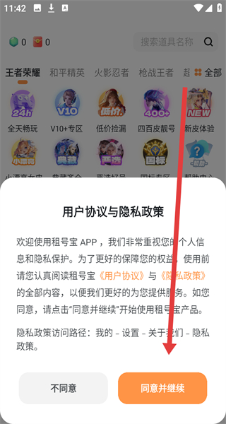 1、点击“用户协议与隐私政策”弹窗的“同意并继续”,进入租号宝APP首页。