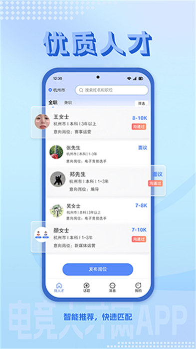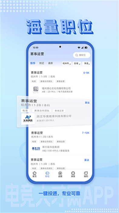 电竞人才网app是一款专门为了用户们寻找电竞工作内容打造出来的软件,用户们可以在这款软件里面寻找十分专业的电竞招聘的行业信息,保护用户们自己个人的隐私信息的内容避免在职状态会影响用户们去进行寻找工作。
