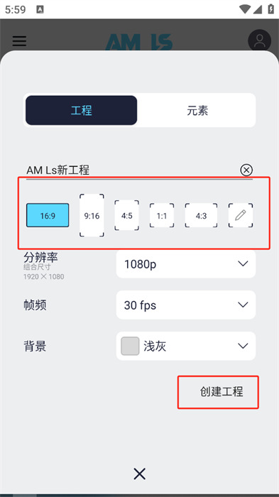 4、最后,我们进入新页面能看到一些尺寸和画布的选项,设置完成之后点击【创建工程】即可开始编辑视频。