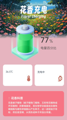 花香充电软件是一款随时都能装饰充电页面的趣味软件,这里不仅能够了解充电的细节,还可以挑选现成的壁纸来装饰,让整体看起来更加清爽整洁,也能增加每次充电中的趣味性,并且还能根据当前设备的定位来进行推送天气,让大家都感受到当天的风速以及气温变化,合理的安排自己的出行情况,不仅如此,每次大家在线充电的次数也能保存下来,并总结出目前你电池的最新情况,让自己能够重视电池健康。