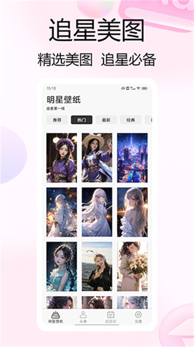 泡泡追星是一款专门为了用户们美化手机桌面打造出来的软件,这款软件里面拥有各种各样的明星壁纸资源的内容,许许多多精心挑选的壁纸资源的内容都尽在其中,全新的壁纸主题可以使用设置开启自己的体验,利用自己的下载功能可以将自己喜欢的壁纸保存下来。