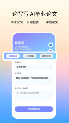 论写写AI毕业论文app是一款能够辅助用户快速进行论文创作的软件,整体软件内都有非常强大的功能,其中还包含了一些非常优质的写作技巧以及思路,让你能对于写论文有更明确的方向,并且这里的资讯能长期保持更新,辅助你高效的完成论文创作,想尝试的用户快来下载吧!