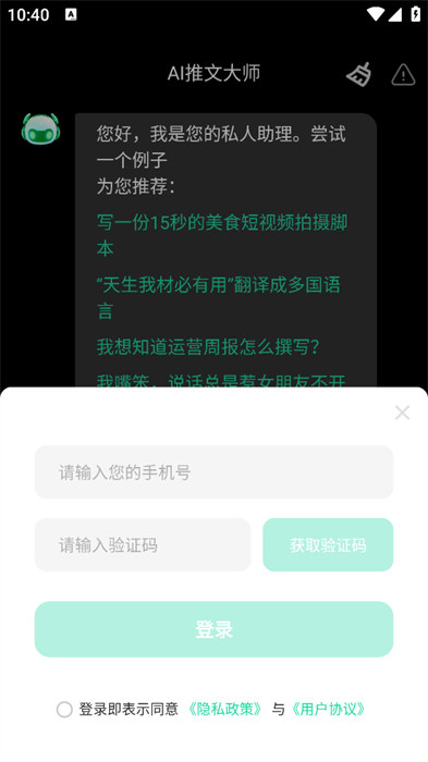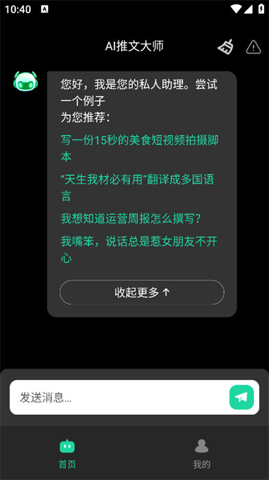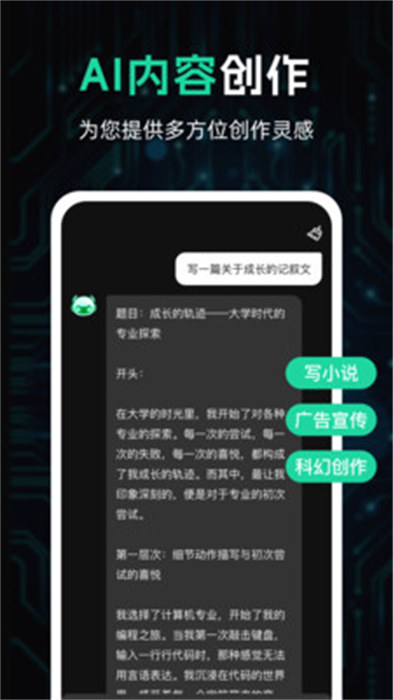 AI推文大师app是一款十分好用的创作内容的软件,这款软件可以轻轻松松的创作出小说和文案等许许多多种的内容,智能的创意引擎只需要用户们点击一下就可以完成内容的创作操作,全部都是一些非常实用的功能内容供用户们去进行使用,创作内容的操作可以变得更加的轻松简单,不管是文章的构思还是视频的脚本等内容都可以帮助用户们轻松解决,让用户们可以拥有更多的内容创作的灵感,欢迎有需要的用户们直接去进行下载体验的操作。