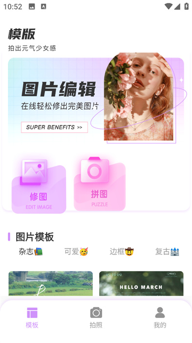悦拍相机软件是一款强大的智能拍摄软件,这里给用户添加了现成的专业摄影模式,新手也能通过简单的功能来进行处理和使用,同时软件内还增添了很多现成的模版,如复古、时尚等等,这些模版都能辅助用户减少修图的繁琐,可以直接导出照片,不仅如此,目前也整理了批量处理图片的工具,这样大家都能非常高效的将图片来调整,完全能满足很多小伙伴的需求,这些编辑图片的记录也能同步到账号当中,想尝试的用户快来下载吧!