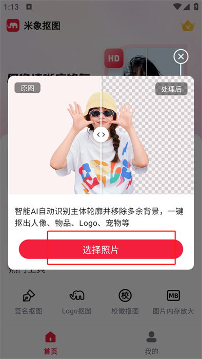 2、点击【智能抠图】按钮,会出现一个弹窗,点击【选择照片】,如下图所示;