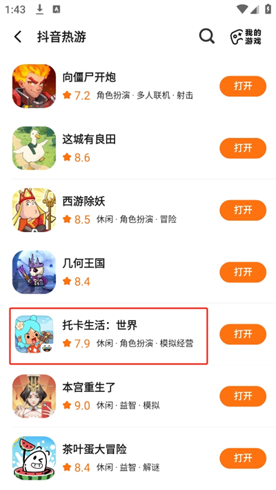 3、进入后将会看到超多抖音中较为热门的游戏选择,我们以托卡生活世界游戏为例;
