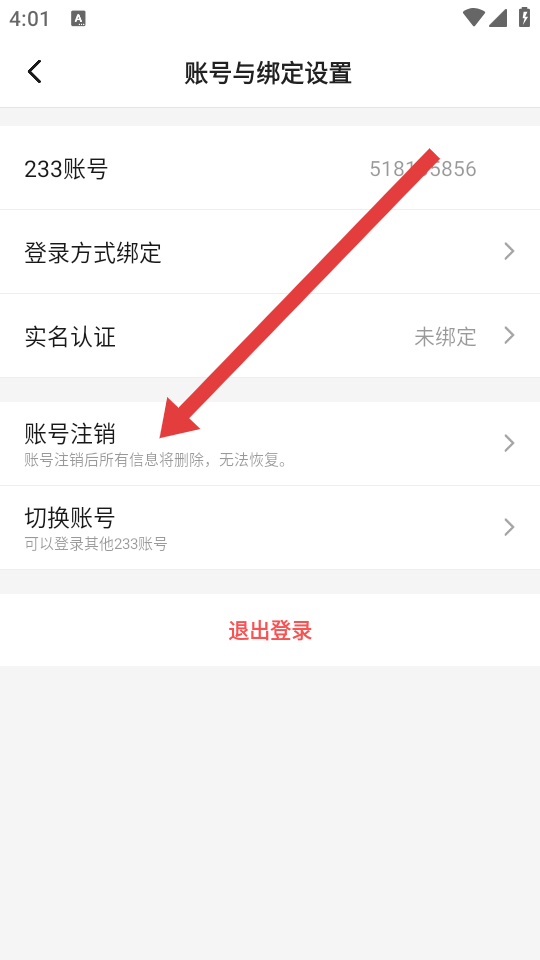 3、在账号与绑定设置页面,点击账号注销选项,进入账号注销协议的页面。