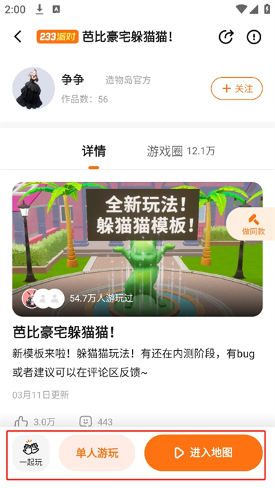 5、了解派对地图的作者是谁,还能看到这个地图有多少人游玩过等等信息,在游玩上支持多种模式一起玩、单人游玩、直接游玩等。