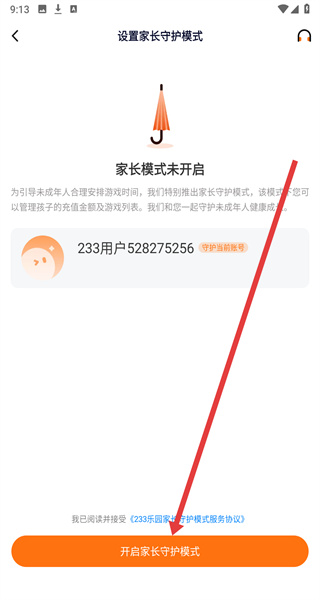 4、在进入到设置家长守护模式页面,可以点击下方开启按钮,完成家长模式设置。