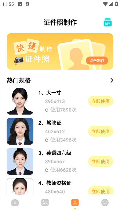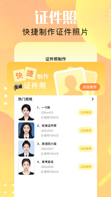 这里给用户增添了一些证件照的模版以及尺寸,轻松就能获取到完整的证件照画面,同时还能对人物进行美颜处理。