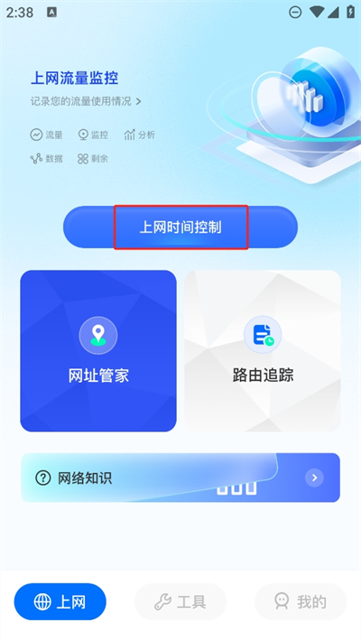 1、下载安装完毕后直接进入软件,在页面中的最上方就可以看到【上网时间控制】的功能;