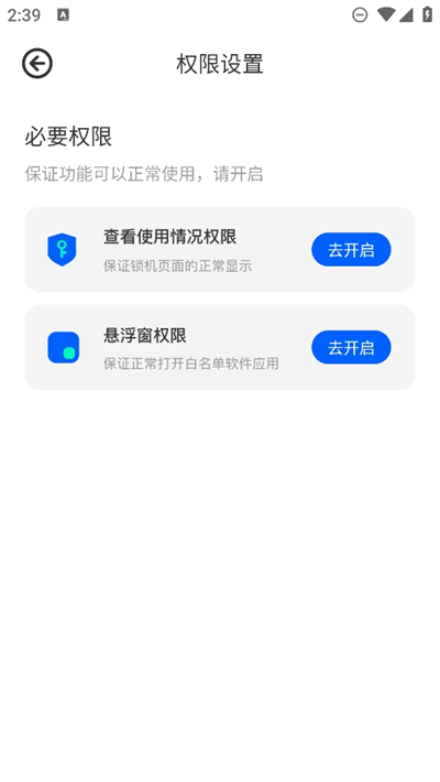 3、如论选择什么控制模式都需要开启【权限设置】,必须要开启【查看使用情况权限】、【悬浮窗权限】才能正常使用;